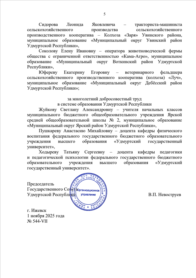 Постановление Президиума Государственного Совета УР от 01.11.2025 N 544-VII