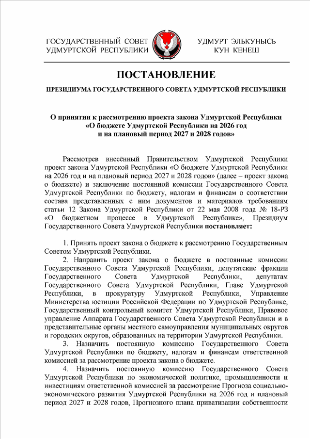 "О принятии к рассмотрению проекта закона Удмуртской Республики "О бюджете Удмуртской Республики на 2026 год и на плановый период 2027 и 2028 годов"