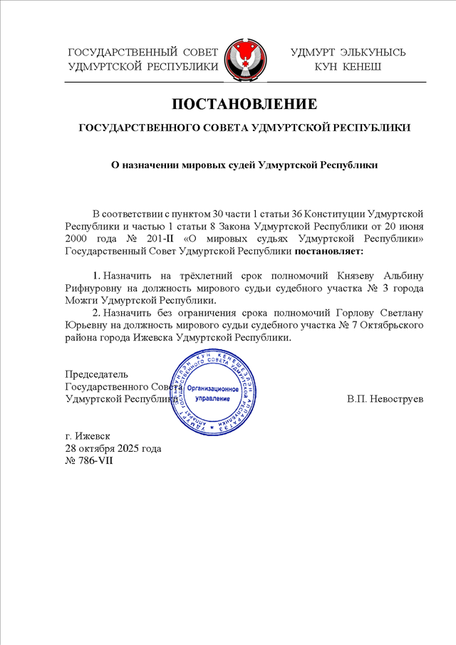 Постановление Государственного Совета УР от 28.10.2025 N 786-VII