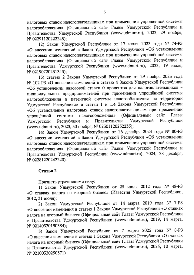 "О признании утратившими силу Закона Удмуртской Республики "Об установлении налоговых ставок налогоплательщикам при применении упрощенной системы налогообложения" и Закона Удмуртской Республики "О ставках налога на игорный бизнес"