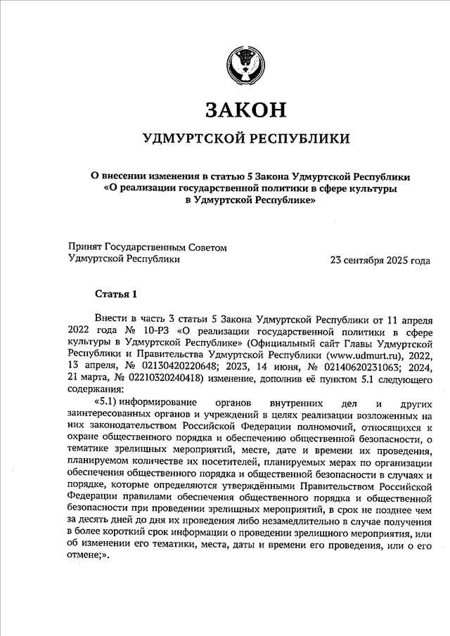 (принят Государственным Советом УР 23.09.2025) (Зарегистрировано в Управлении Минюста России по УР 29.10.2025 N RU18000202500955)