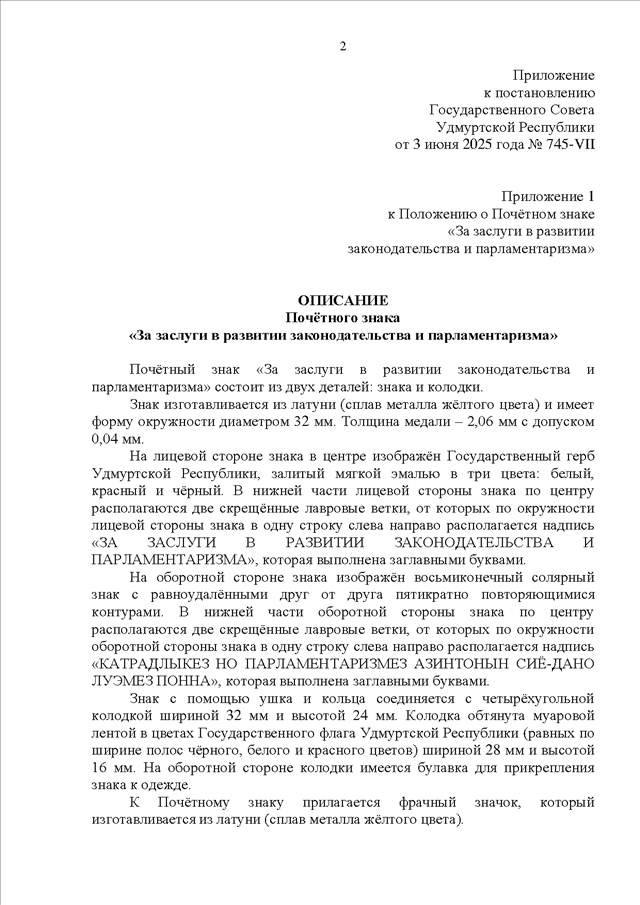 "О внесении изменения в постановление Государственного Совета Удмуртской Республики от 27 марта 2025 года N 689-VII "О Положении о Почетном знаке "За заслуги в развитии законодательства и парламентаризма"