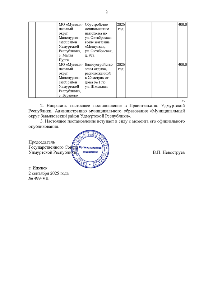 Постановление Президиума Государственного Совета УР от 02.09.2025 N 499-VII