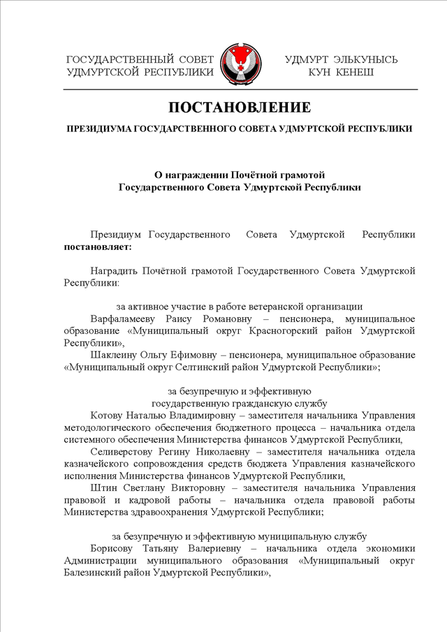 "О награждении Почетной грамотой Государственного Совета Удмуртской Республики"