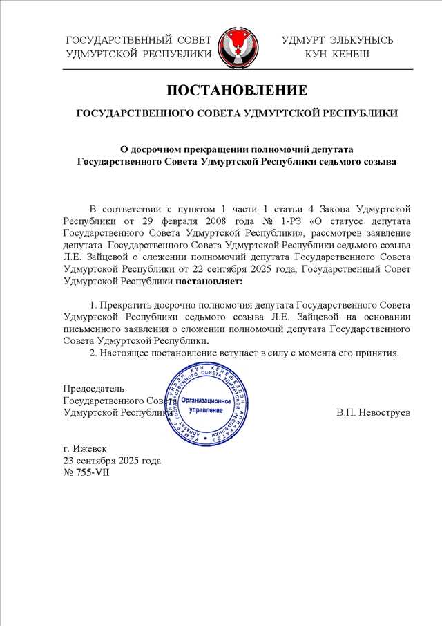 Постановление Государственного Совета УР от 23.09.2025 N 755-VII
