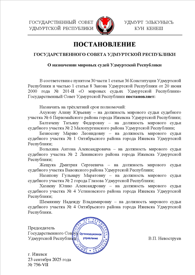 Постановление Государственного Совета УР от 23.09.2025 N 756-VII