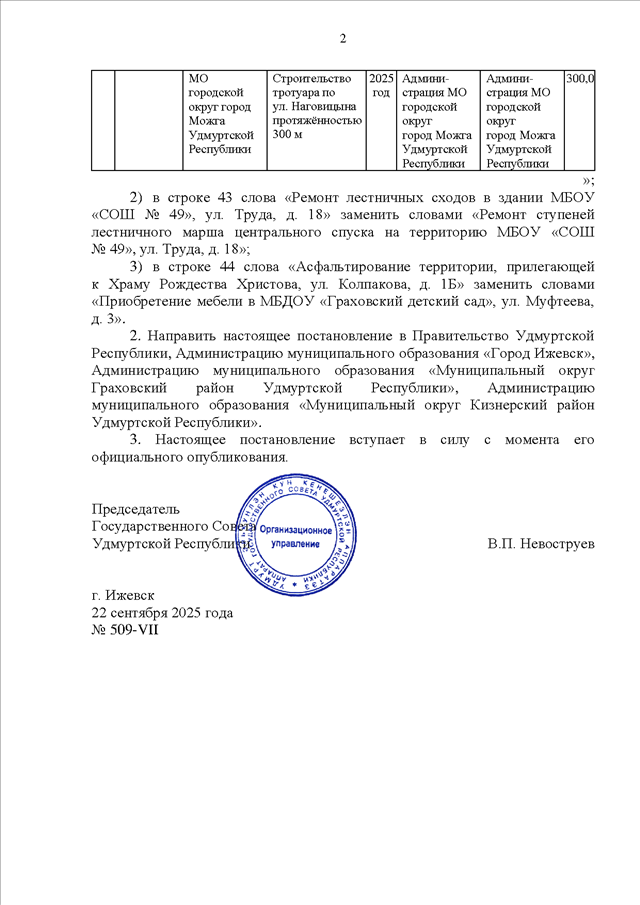 Постановление Президиума Государственного Совета УР от 22.09.2025 N 509-VII