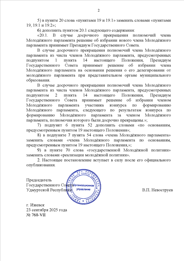 Постановление Государственного Совета УР от 23.09.2025 N 768-VII