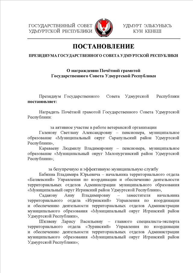 "О награждении Почетной грамотой Государственного Совета Удмуртской Республики"