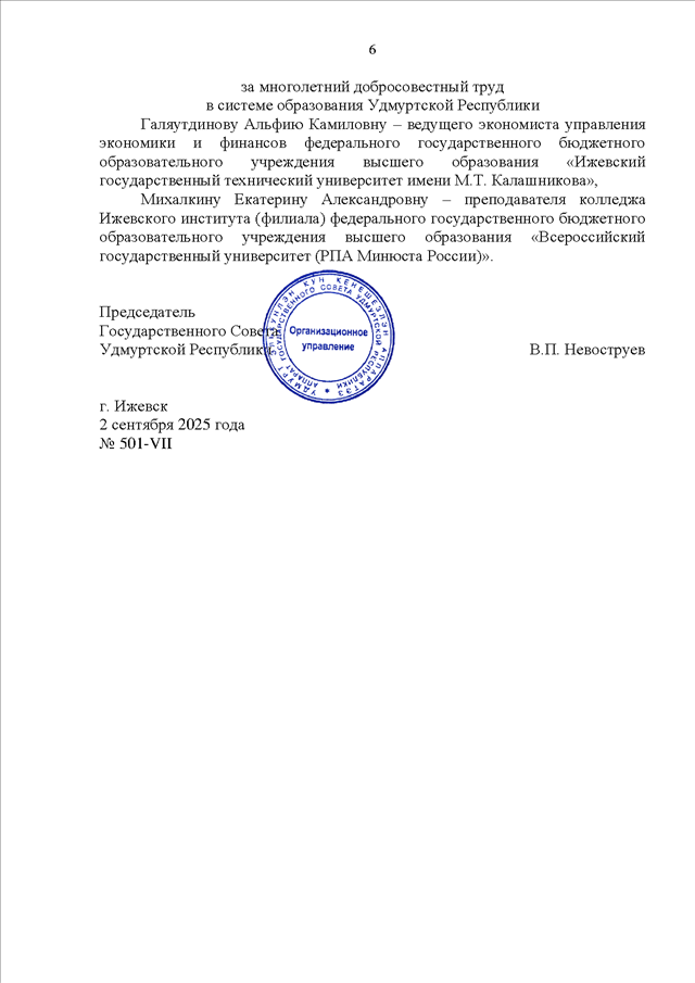 Постановление Президиума Государственного Совета УР от 02.09.2025 N 501-VII