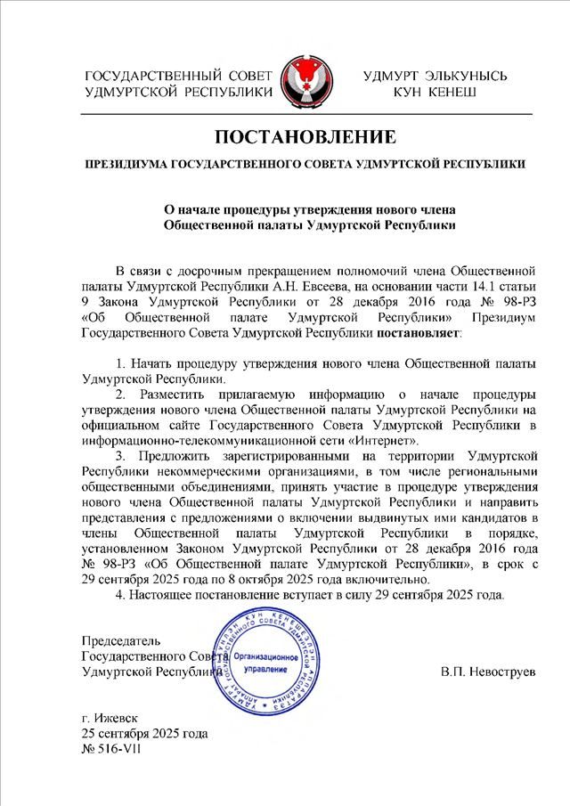 Постановление Президиума Государственного Совета УР от 25.09.2025 N 516-VII